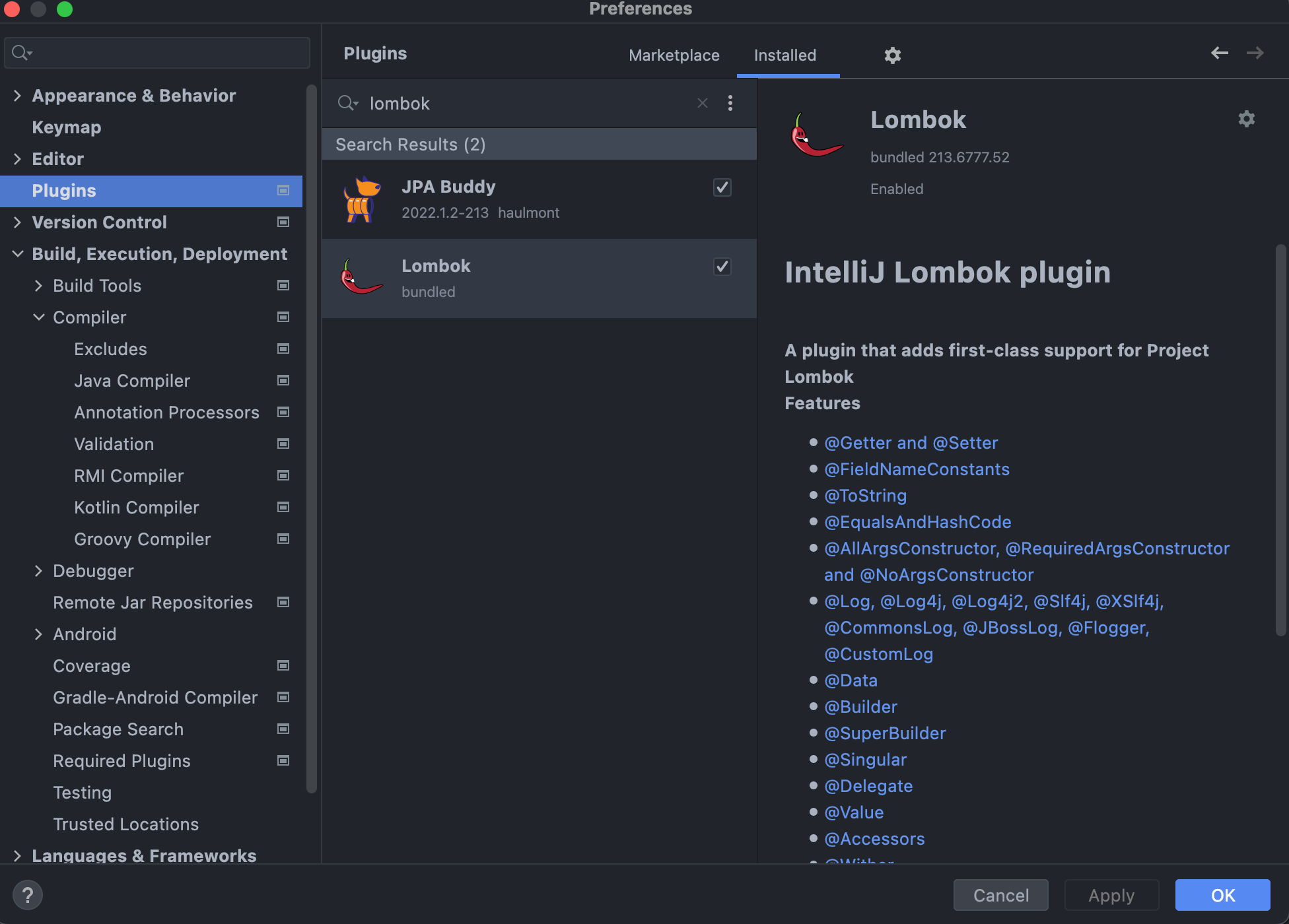 1. IntelliJ에서 Preferences(⌘,) 창에서 Plugins → lombok 설치