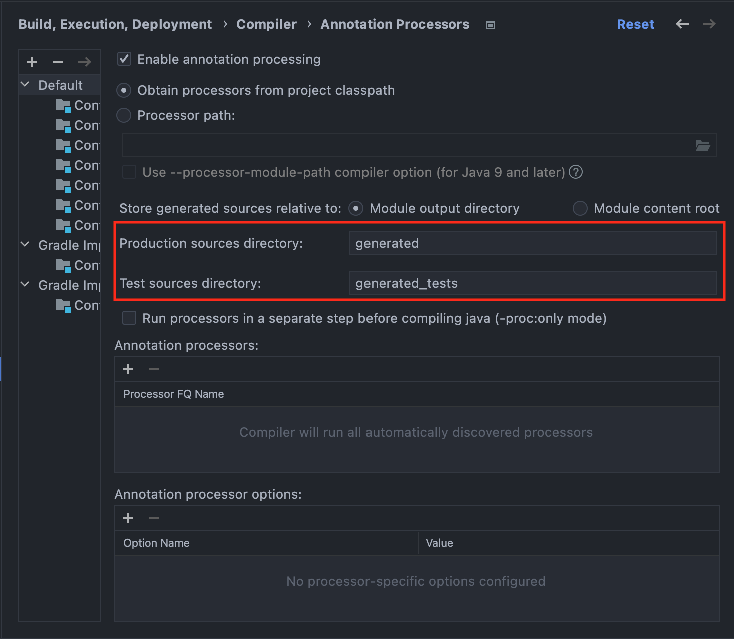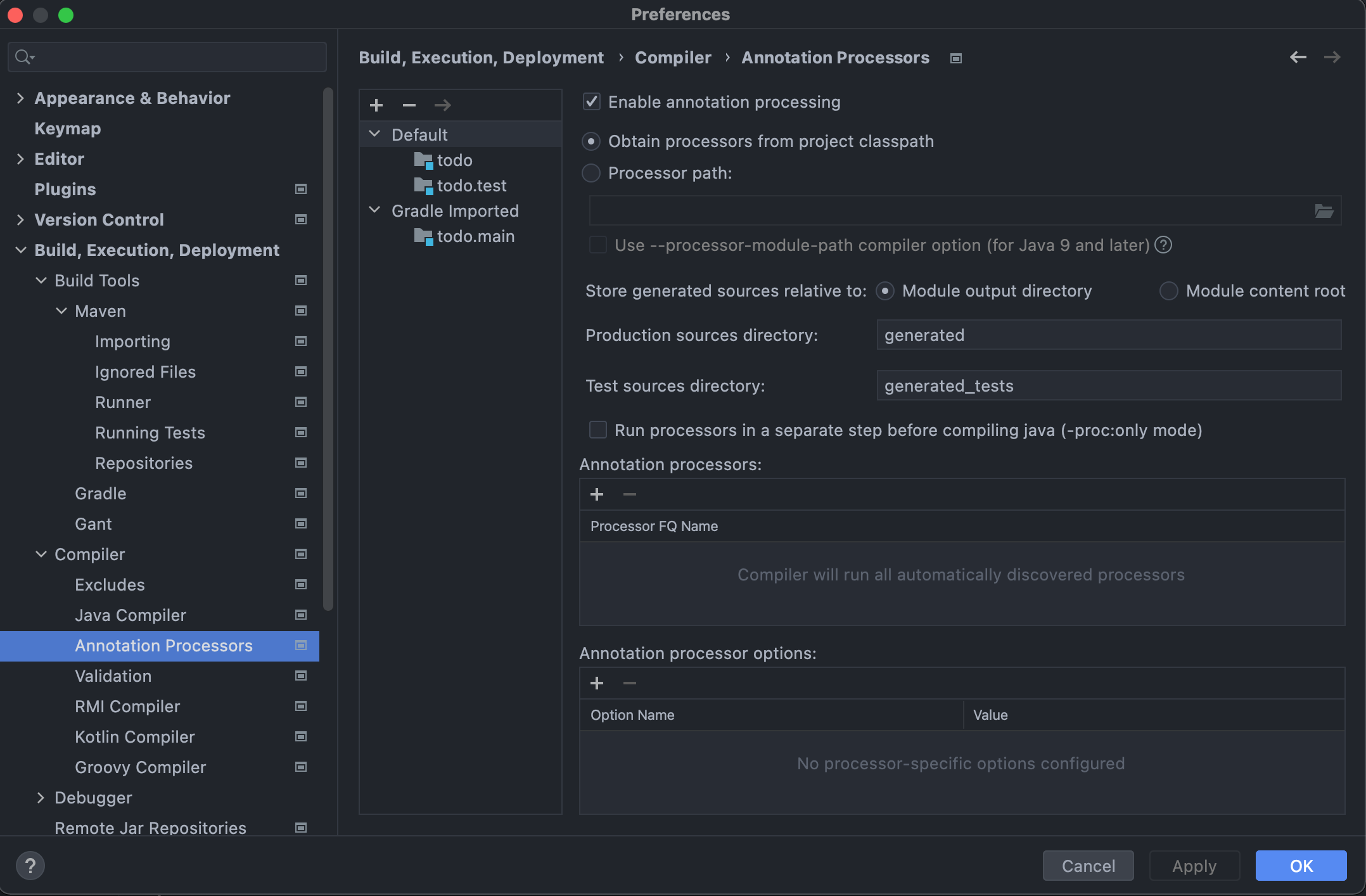 Preferences(⌘,) → Build, Execution... → Compiler → Annotation Processors